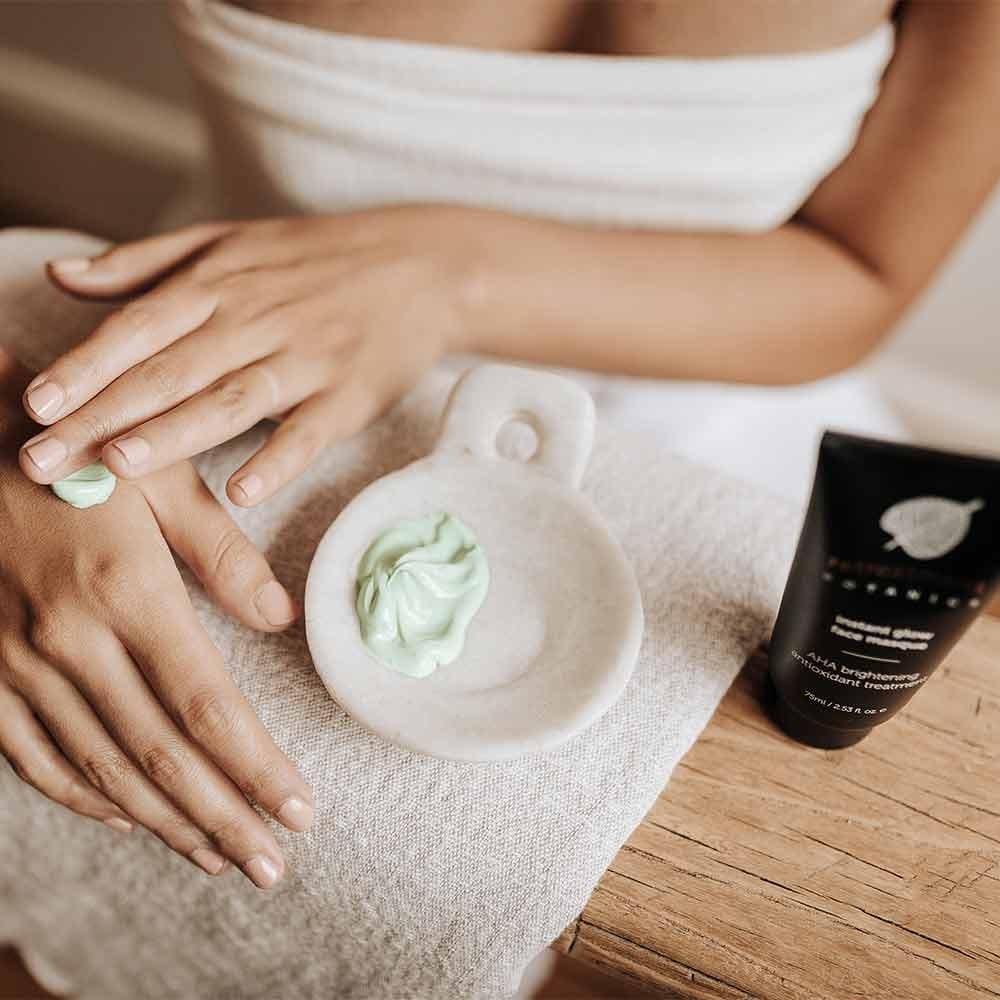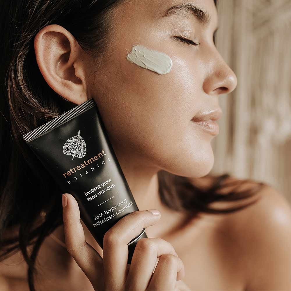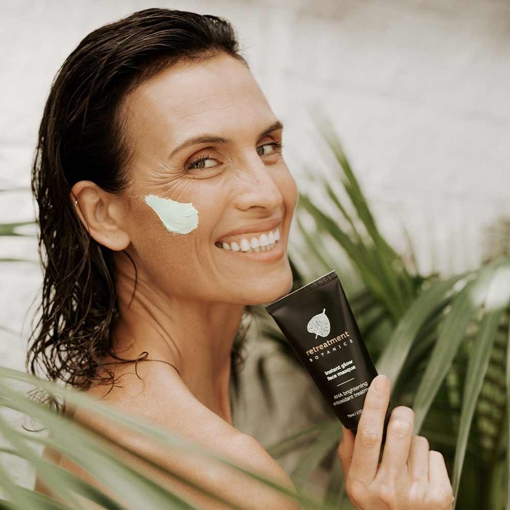 Retreatment Botanics Instant Glow Face Masque 75ml. For radiant glowing skin. This divine face masque is nutrient and antioxidant rich with gentle fruit acids and Papaya enzymes which will visibly brighten and renew your skin. This nutrient rich clay will enrich and give you a lovely, healthy glow and leave your skin feeling fresh and revitalized.