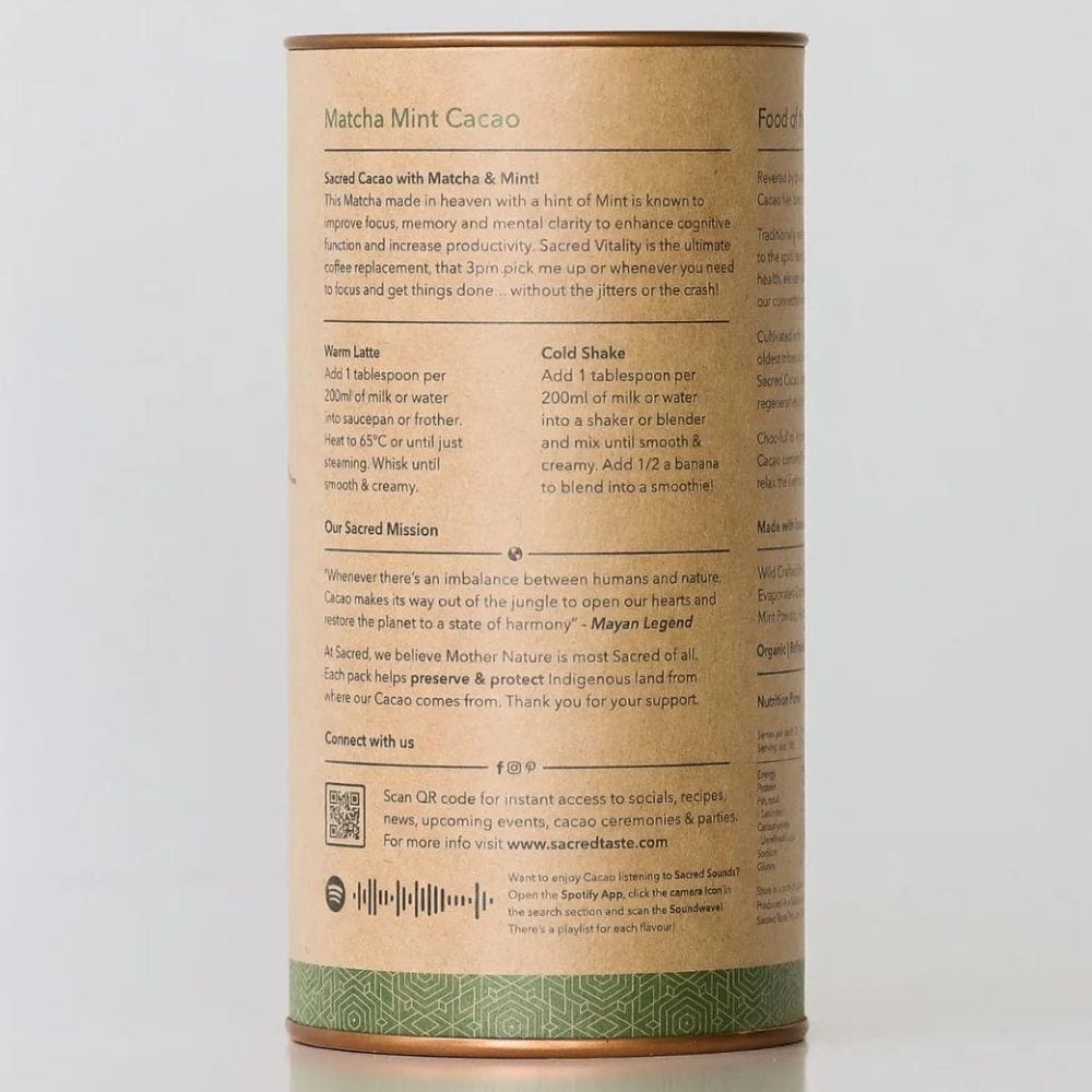 Introducing Sacred Vitality - a blend of Matcha, Mint and Cacao Powder that is the ultimate coffee replacement! Perfect to add to hot or cold beverages and even treats. Made from 100% organic and wild crafted ingredients. Vegan, ethically sourced and delicious! 250g | 25 serves.