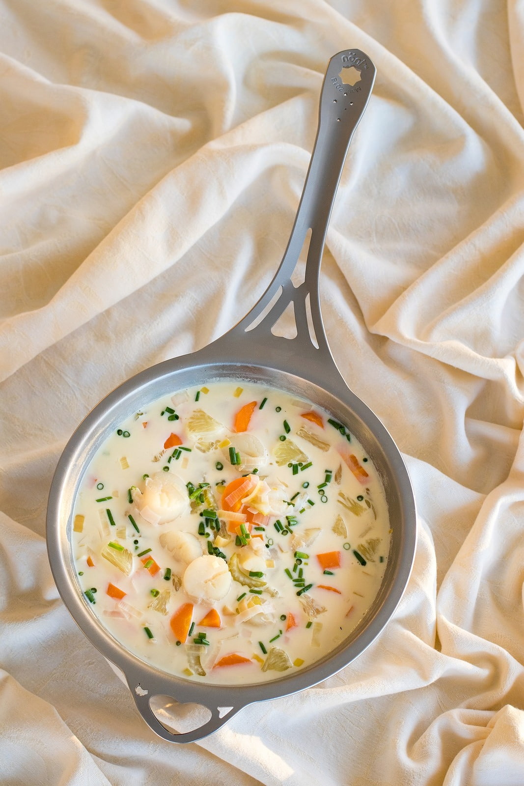 For stuck food bits (which can result from adding cold food to a hot pan—see above!): Scrub the pot with a non-abrasive sponge to get off any food bits you can, then fill the pot or pan with enough soapy water to cover the food, bring to a boil, and scrape (the food should come away easily).