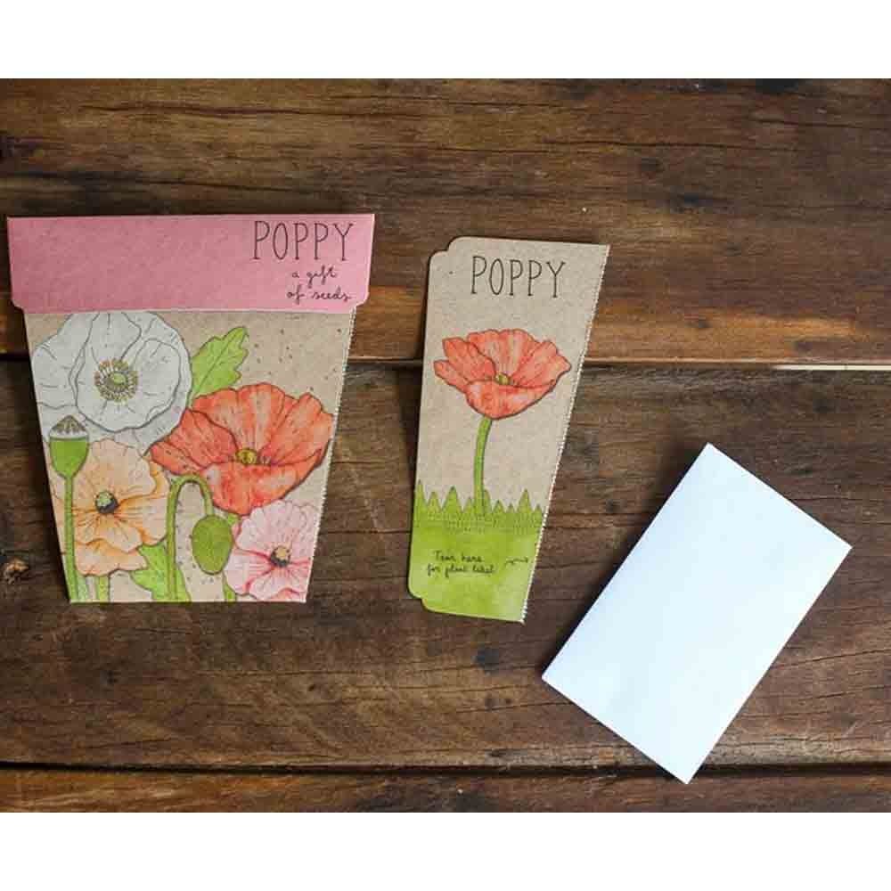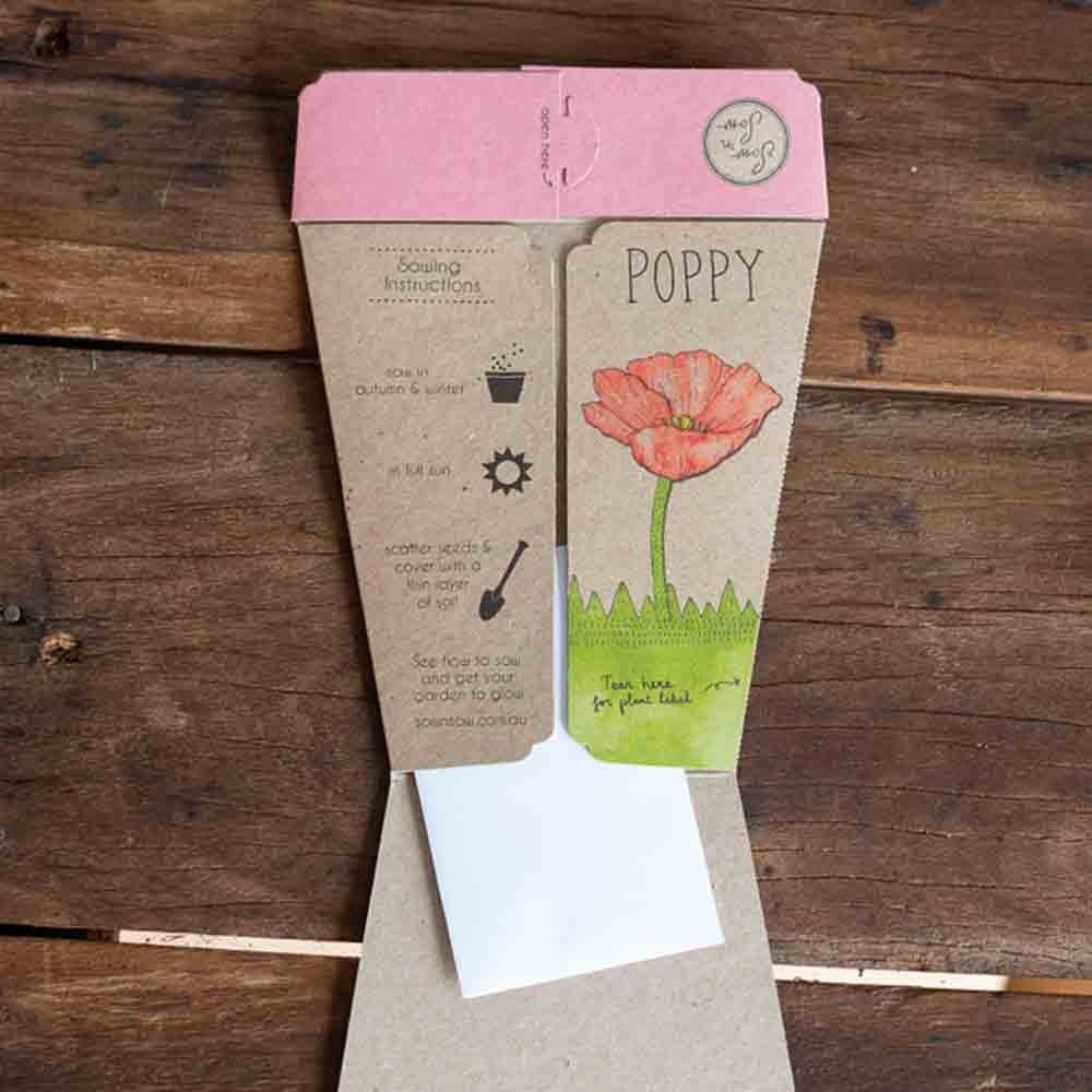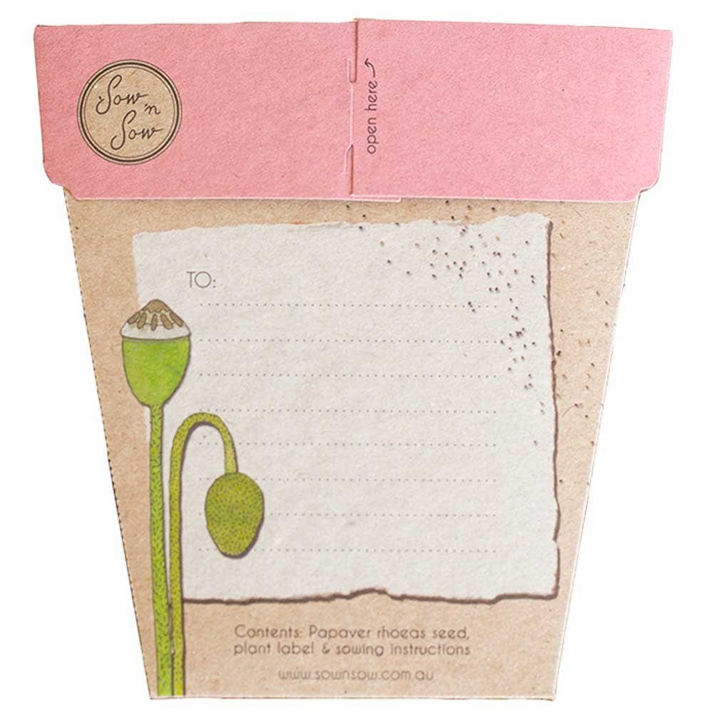 Sow 'n Sow Gift of Seeds Greeting Card - Poppy. This greeting card is made from 100% post-consumer recycled paper and contains Poppy flower seeds. Give the gift of growing your own beautiful flowers. A great gift for keen gardeners or aspiring green thumbs.