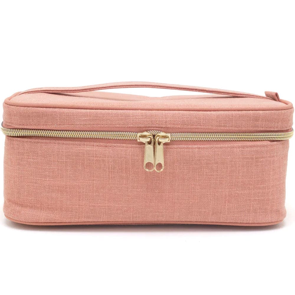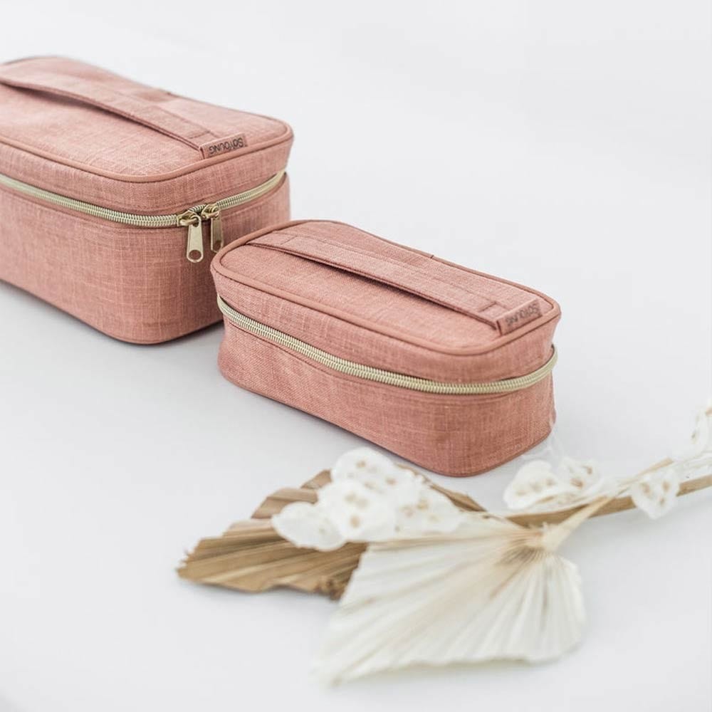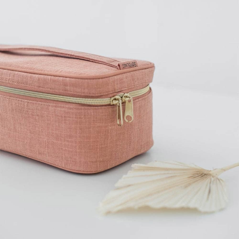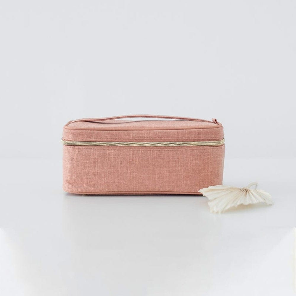 SoYoung Large Raw Linen Makeup Bag Beauty Poche - Muted Clay. A full sized makeup and beauty bag, ideal for your beauty essentials, like makeup and toiletries. Keep them safe and organised at home or when travelling. The outer is made from a textured and durable cotton and linen fabric, and it's lined with an easy-to-clean insulated interior. Fitted with a handy removeable insert and mesh pocket, and finished with a clutch handle and gold-look hardware.