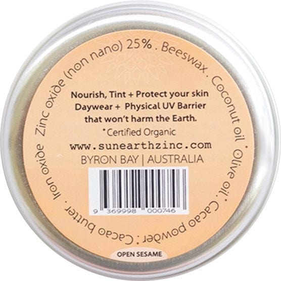 Sun & Earth Natural Zinc - Sandy Light. A completely natural, biodegradable tinted all-day cream, that protects the skin with a zinc sun barrier with SPF 30+. Colour is a light Sandy Light". Comes in a 50g tin.