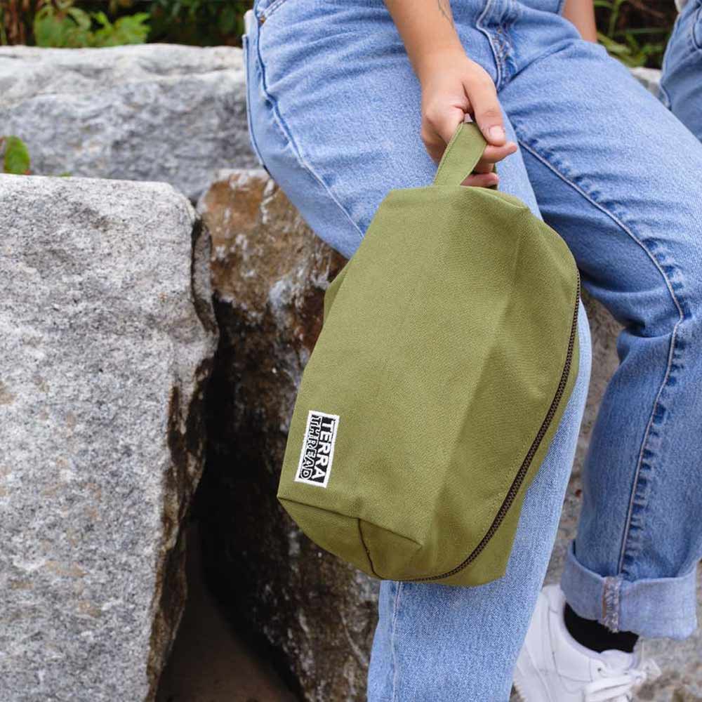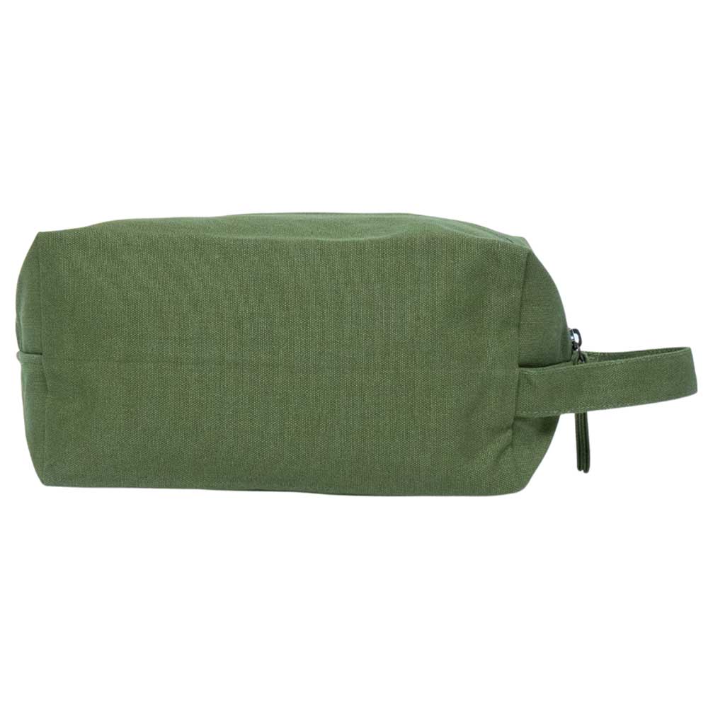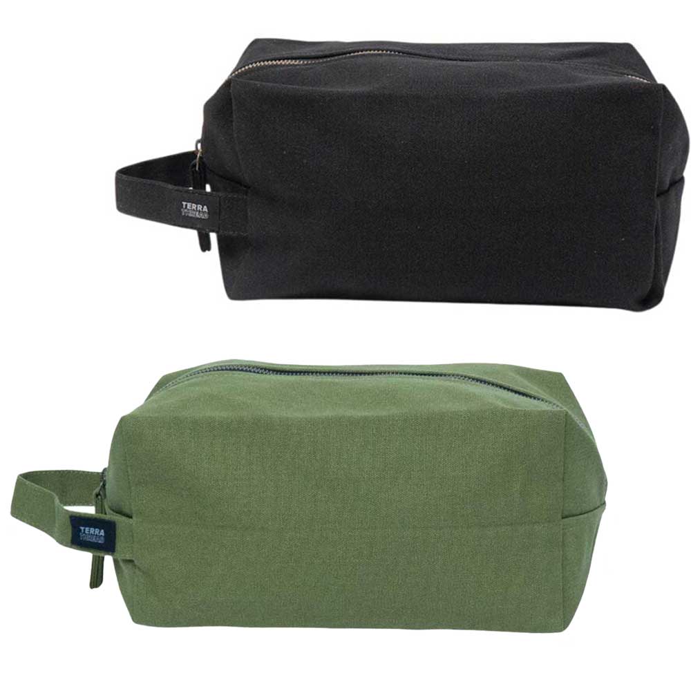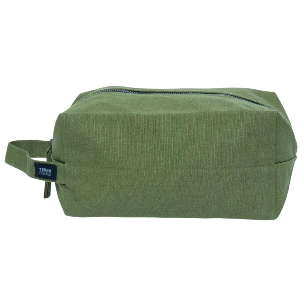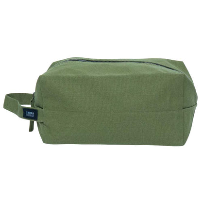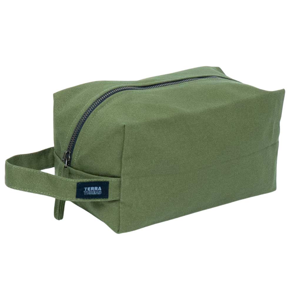 Terra Thread Toiletry Bag - Olive. A toiletry bag made out of heavy duty 14-oz Fair trade organic cotton, with lead-free bag accessories. A minimalist look with big values means this eco-friendly toiletry bag supports both you and the planet.
