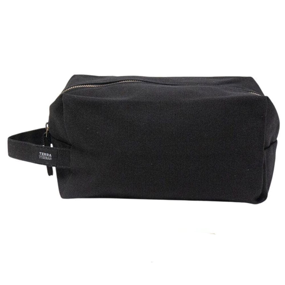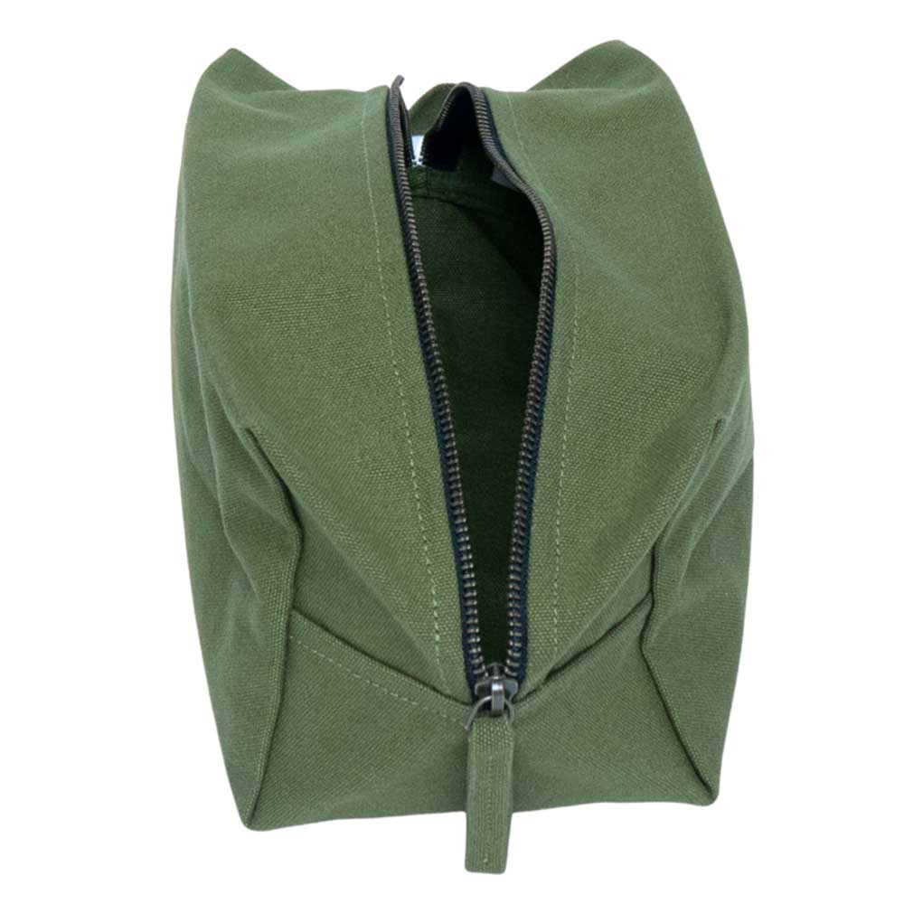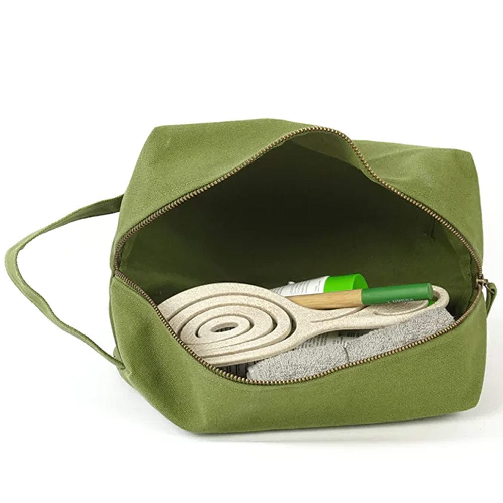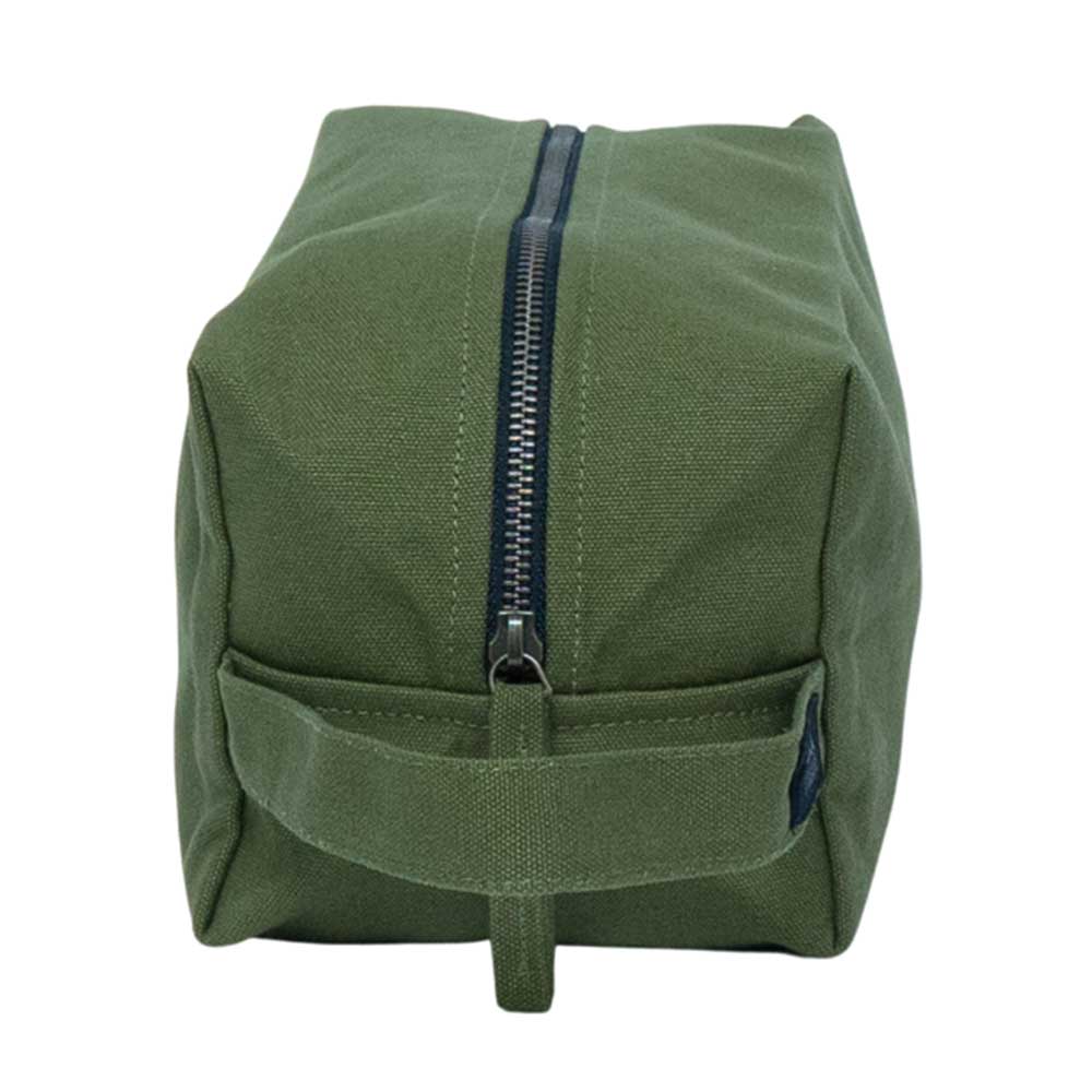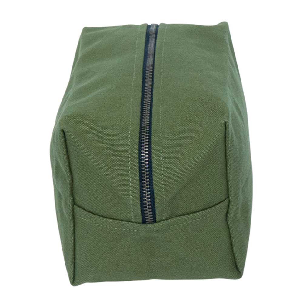 Terra Thread Toiletry Bag - Olive. A toiletry bag made out of heavy duty 14-oz Fair trade organic cotton, with lead-free bag accessories. A minimalist look with big values means this eco-friendly toiletry bag supports both you and the planet.