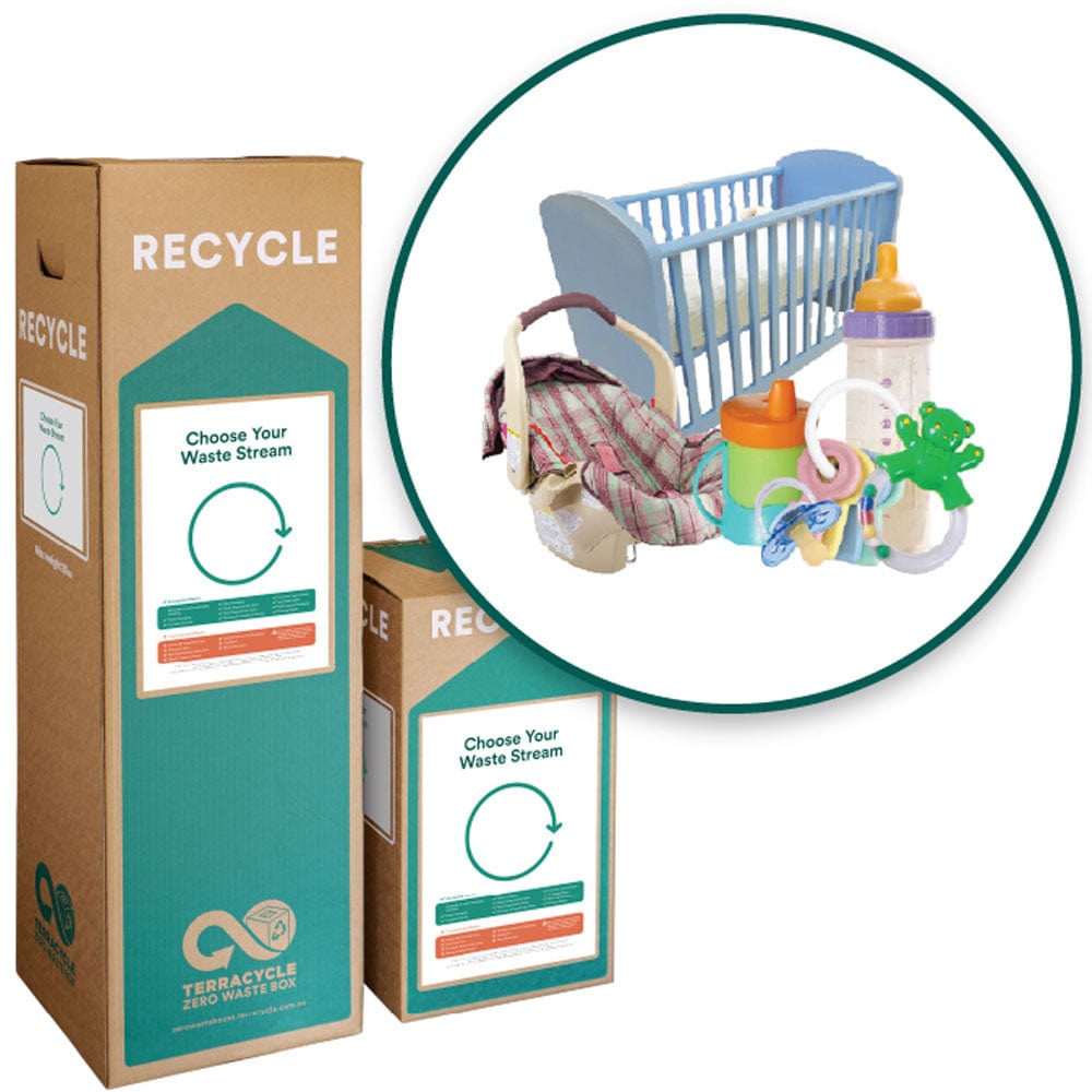 TerraCycle Zero Waste Recycle Bin - Baby Gear. Use this box to recycle used baby toys, playmats, seats, swings and other baby accessories including sippy cups, non-electric breast pumps, pacifiers and more. See the full list below! Reduce your waste by recycling unrecyclable" products. Small and medium sizes available.