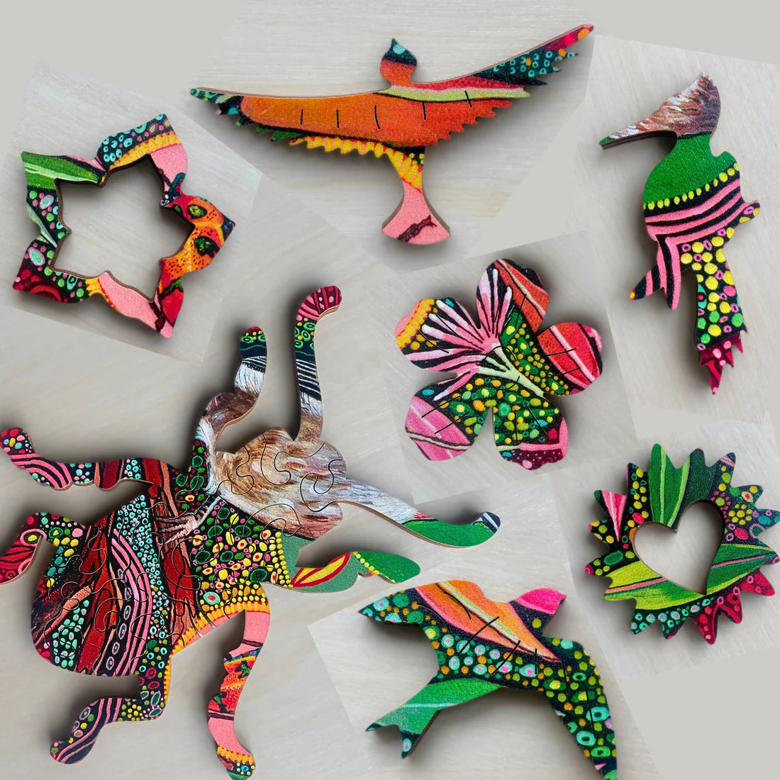 Experience the artistry of a wooden jigsaw puzzle by Twigg Puzzles. A stunning puzzle featuring art by Naomi Malone. Powderpuff lillypilly florals and the beautiful fauna that inhabit it make up this wonderfully creative piece.