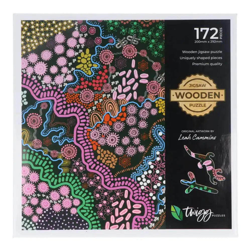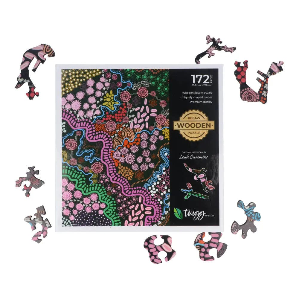 This beautiful wooden jigsaw puzzle by Twigg Puzzles is a great gift idea that celebrates Australia. A 172-piece jigsaw puzzle that features original art by artist Leah Cummins and uniquely shaped wooden puzzle pieces for extra fun. Perfect for adults looking for a relaxing yet creative challenge. Artist Artwork by Bunya Designs Authentic Aboriginal Art - "Bunya Sister".