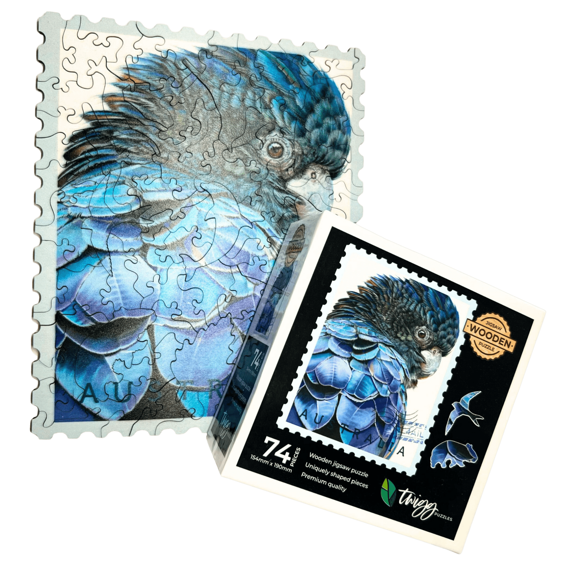 This Wooden Jigsaw Puzzle, Blue Bird by Sally Edmonds, is a piece of functional art. Shaped like a stamp and featuring unique puzzle pieces in the shapes of Iconic Australia flora, fauna and more, this puzzle is a great gift idea that celebrates Australia.