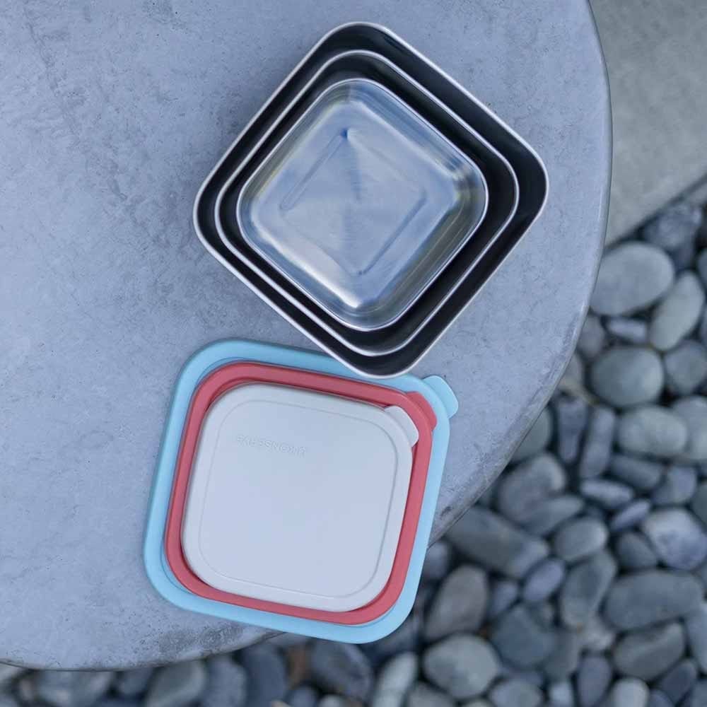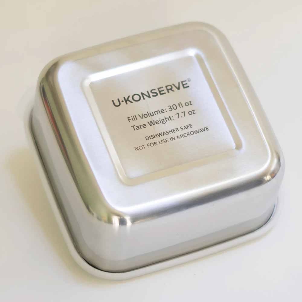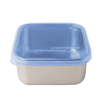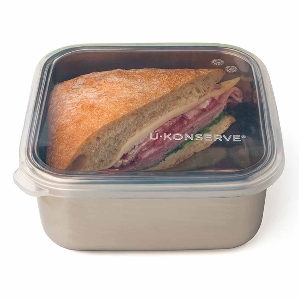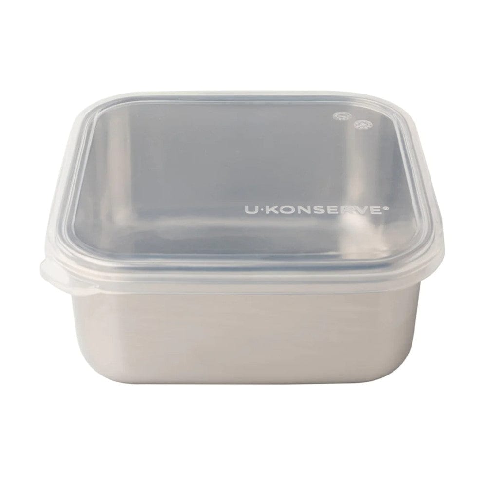 U Konserve Square To-Go Container Medium 30oz/0.9L - Clear Silicone. This made-to-last, stainless steel (18/8) container is a zero waste food storage solution. Great as a lunch box or container for leftovers. This durable and attractive container features a food-grade silicone lid that is glass clear and leakproof.