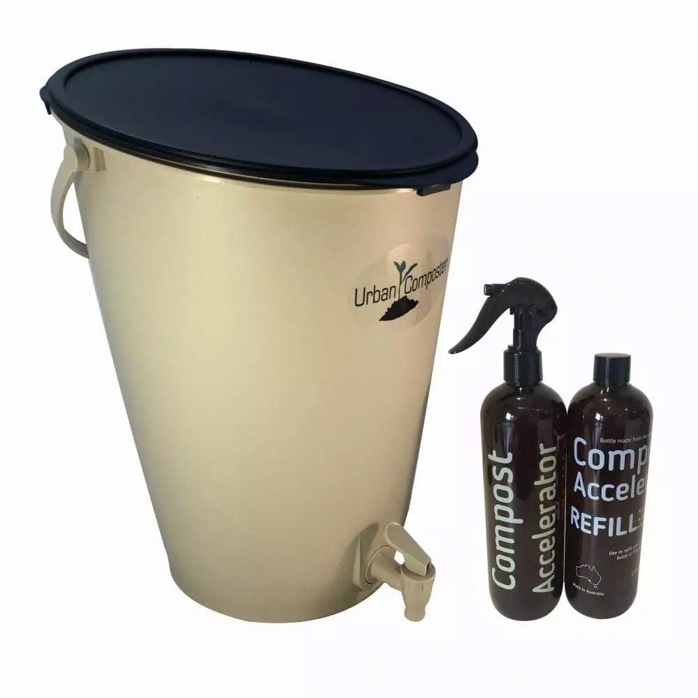 Urban Composter Bokashi Compost Starter Kit 16L - Black. Australian designed and made Bokashi composting system in a generous 16L capacity. This bucket is made from recycled plastic to further your commitment to the war on waste! Comes with a convenient liquid EM spray and refill bottle (also packaged in recycled plastic), easy-clip lid and internal tap design. Complete with instructions.