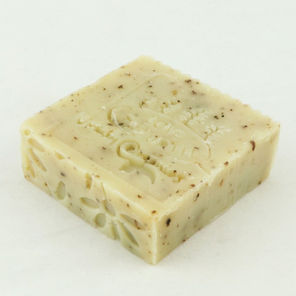 Saponified *olive oil, coconut oil, *cocoa butter, *shea butter, *hempseed oil and macadamia oil teemed with a herbal tea blend of patchouli, kaffir lime, *black tea, *lavender flowers, *fennel seeds & *mandarin peel. *Organic ingredient.