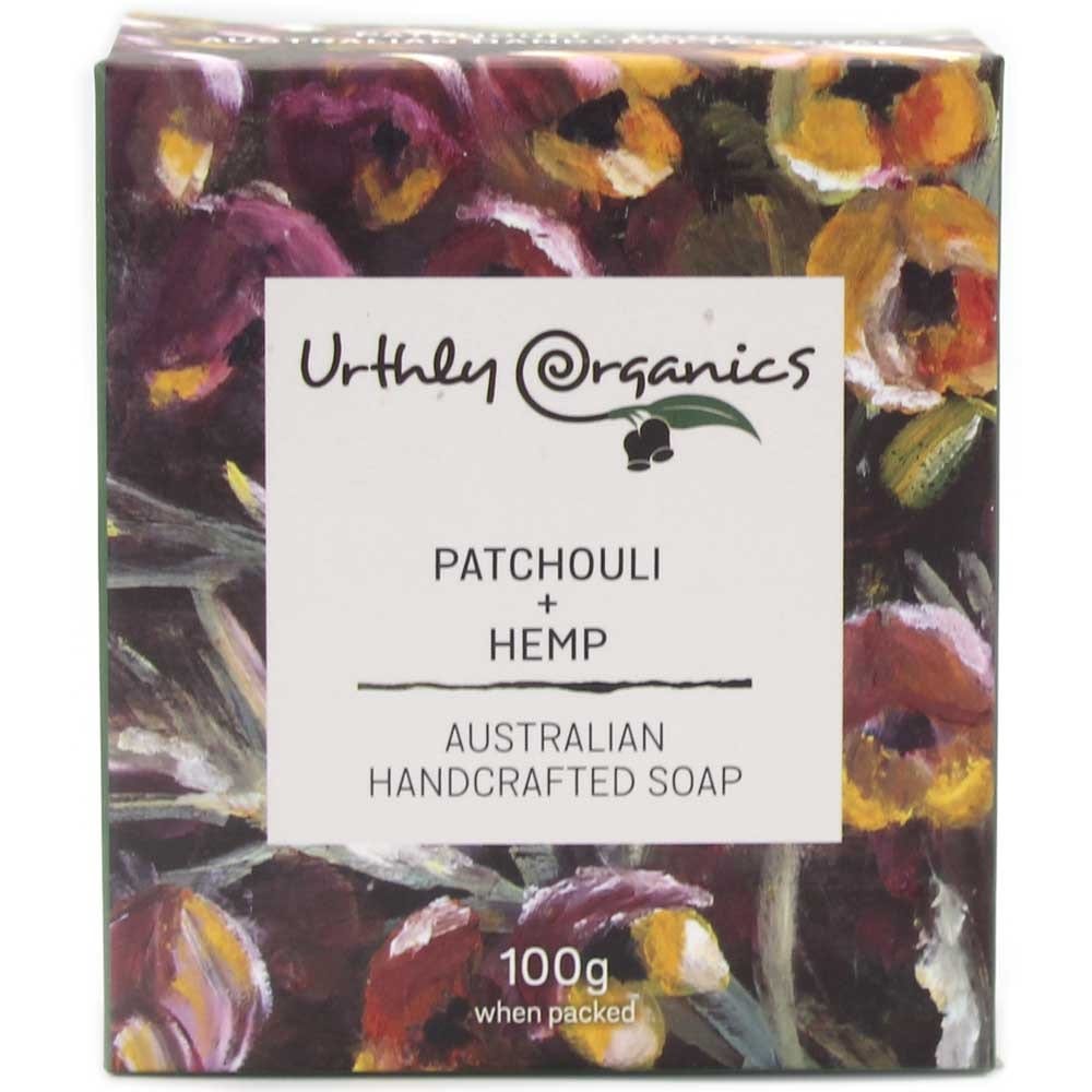 Urthly Organics Soap Bar - Patchouli & Hemp. A palm oil free bar soap made in Central Victoria, Australia with patchouli, ground hemp seeds and Fair Trade Cocoa. A moisturising blend of oils with an earthy scent. Free from SLS, SLES, parabens, fluoride, titanium dioxide, glycols, fragrance and mineral oils. 100g.