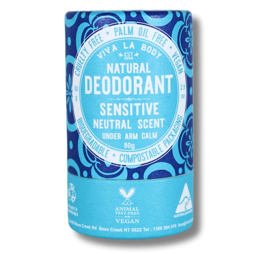 Viva La Body Natural Deodorant 80g - Neutral Sensitive is a bicarb free, vegan-friendly deodorant stick. Magnesium enriched it neutralises odour & absorbs wetness. Packaged in a plastic-free paper push-up stick and scented with essentials selected for their ability to support the natural balance of your microbiome.