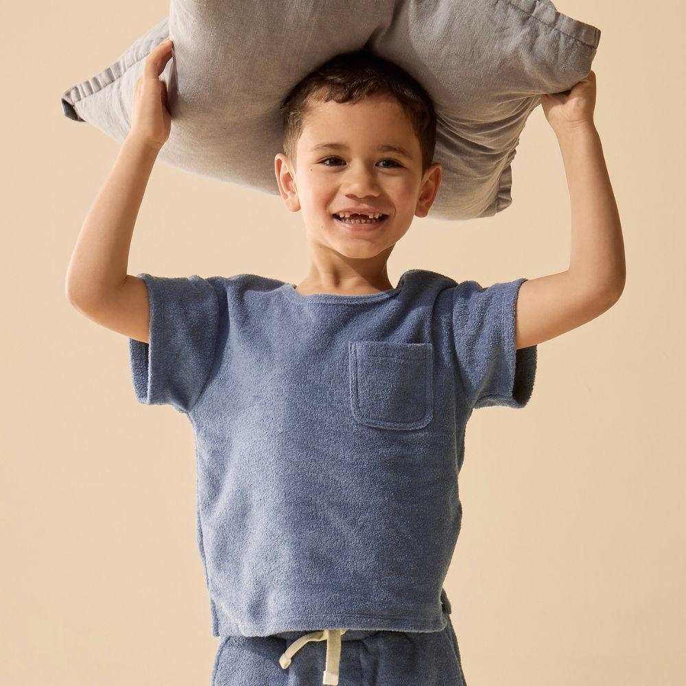This short-sleeve tee is made from GOTS-certified organic cotton terry towelling, offering a soft, absorbent feel that’s perfect for warm-weather play. Designed in a rich deep blue colour, it features a handy side button opening for easy dressing. Gentle on delicate skin and free from harmful chemicals, this breathable and comfy tee is an everyday essential for little ones on the go.