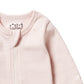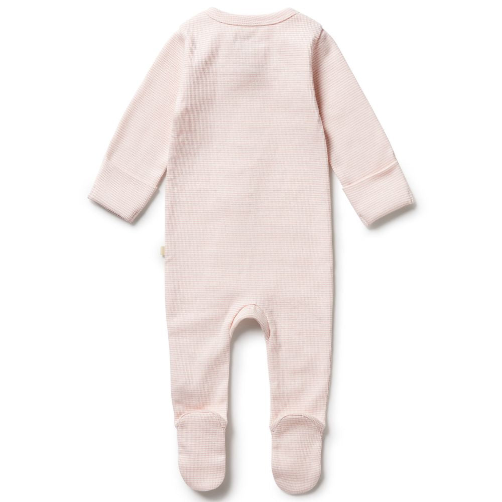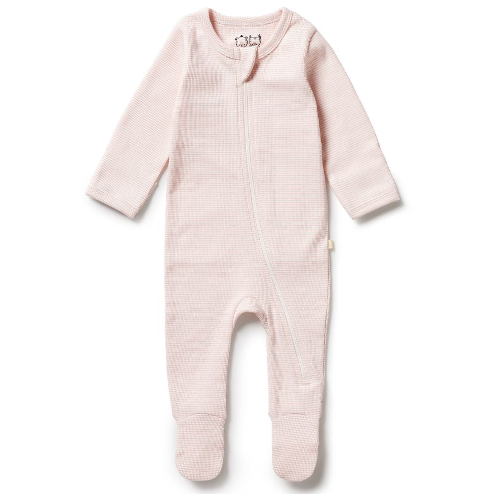 This Organic Stripe Rib Zipsuit in Cantaloupe from Wilson & Frenchy, featuring feet and fold-over mittens in sizes petit to 000, is a must-have for any baby. Made from GOTS-certified organic cotton, it offers softness and comfort for delicate skin while simplifying nappy changes.