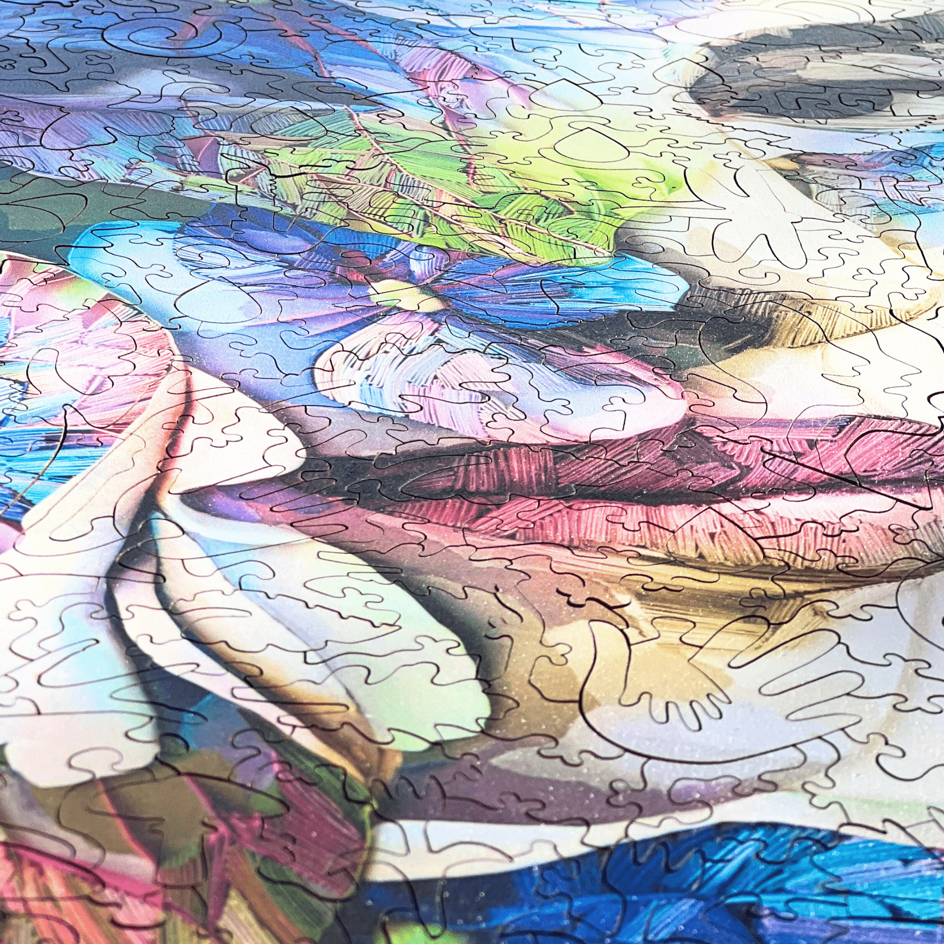 The unusual shaped pieces are all hand drawn in by Dave. These “whimsy” pieces match the theme of the puzzle from animals to characters or geometric shapes.