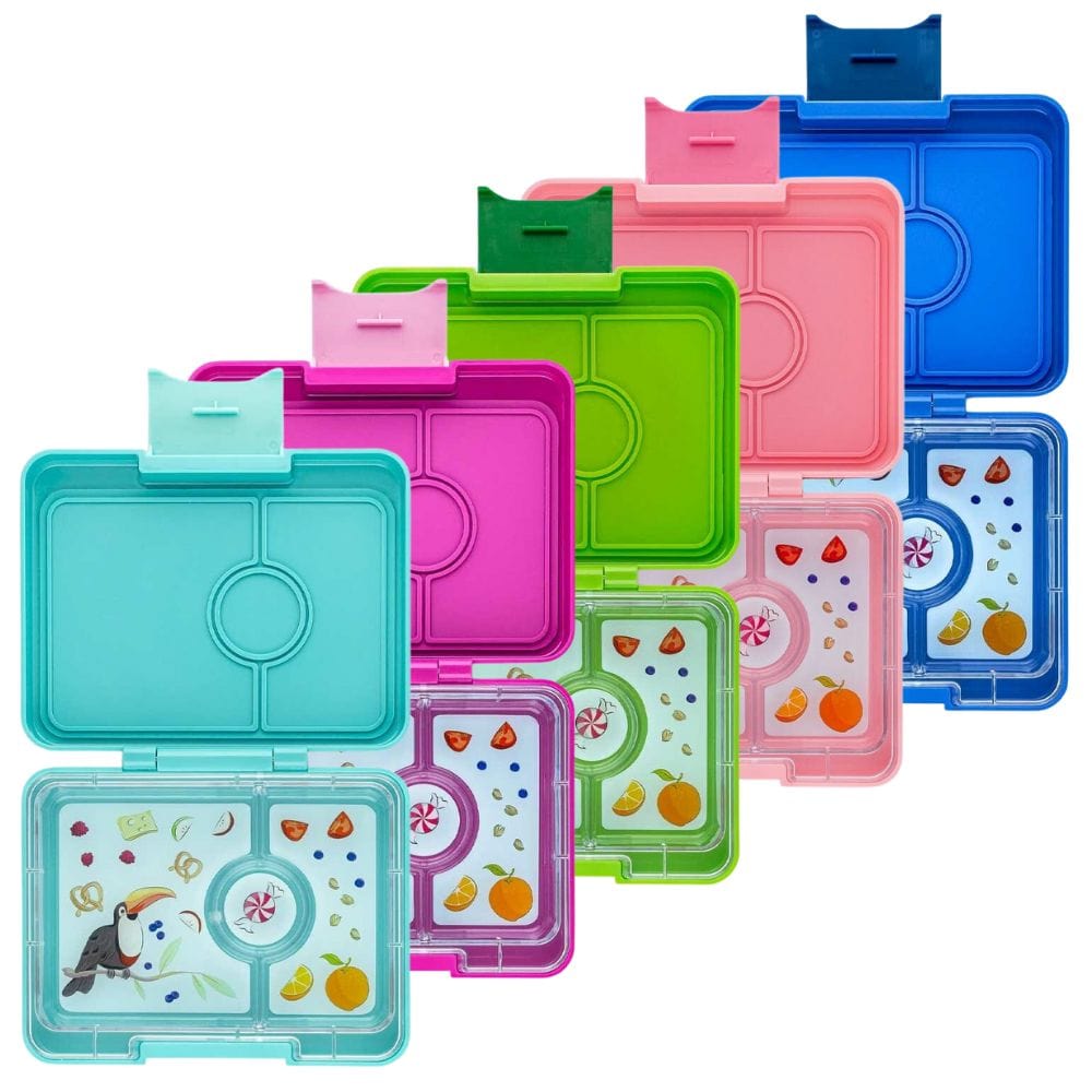 Yumbox is a kid friendly bento box lunch box with a single leak proof lid. PVC free, BPA free.
